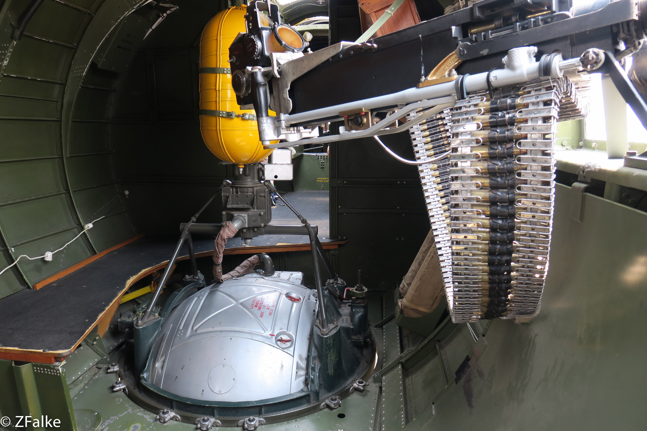 Arriba, el fuselaje trasero con las dos ametralladoras laterales. Centro arriba. Vean el considerable tamaño de los cartuchos de las ametralladoras de calibre "cincuenta" (12,7 mm). La cosa amarilla era uno de los varios depósitos de oxígeno para poder respirar a las tremendas alturas de vuelo. La torreta ventral "de bola" en el suelo era un artilugio de lo más ingenioso que podía girar 360º en horizontal y 90º lateralmente, de tal manera que podías apuntar a cualquier cosa que estuviera en el espacio situado por debajo del plano horizontal del avión. Se ve la mínima portezuela de entrada con sus cierres rojos. Centro abajo. La vista debía ser espectacular. Y dar mucho miedo. Abajo. La torreta de cola debajo del timón de dirección. |