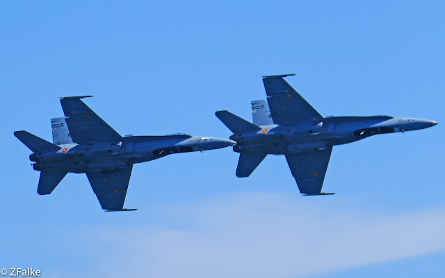 Volando en formación cerrada el C.15-60 (12-18) y el C.15-48 (12-06), ambos del Ala 12 de Torrejón. Vean la cabina de pega pintada en la parte de abajo del fuselaje anterior. En el Festival de Gijón, Asturias, 2017.